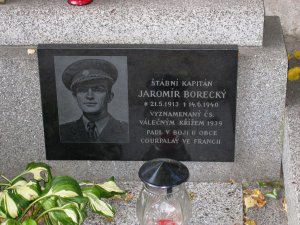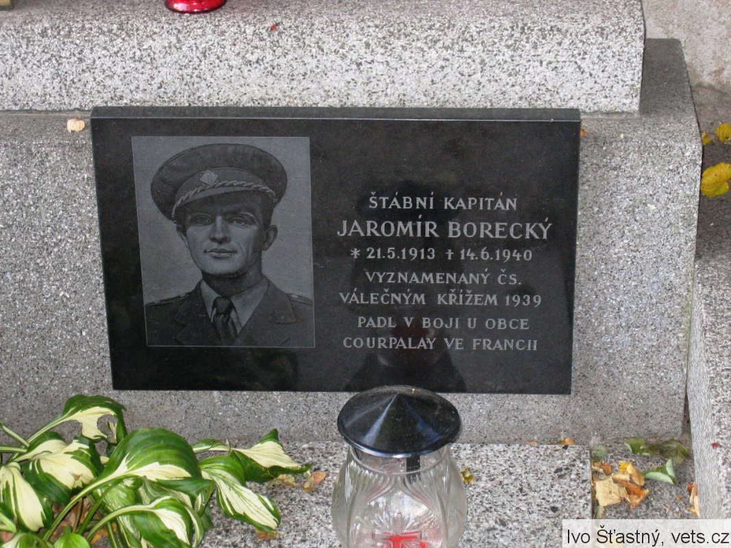 Borecký Jaromír (Jaroslav), poručík, osobní číslo Z; J-1431, příslušník 1. čs. divize ve Velké Británii, Pěší pluk 2, velitelská rota, nar. 21.5.1913, Jindřichův Hradec. Odveden 16.12.1939, Agde, Francie, poručík pěchoty z pov. čs. Padl 15.6.1940, Francie, Rozoy-en-Brie. Odeslán s motočetou k dispozici 239. divize, po válce potvrzeno, že padl u Rozoy-en-Brie, tam pohřben, 19.3.1941 exhumován a pohřben v Courpelay, řada č. 6. (zdroj databáze VÚA Praha)