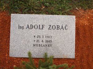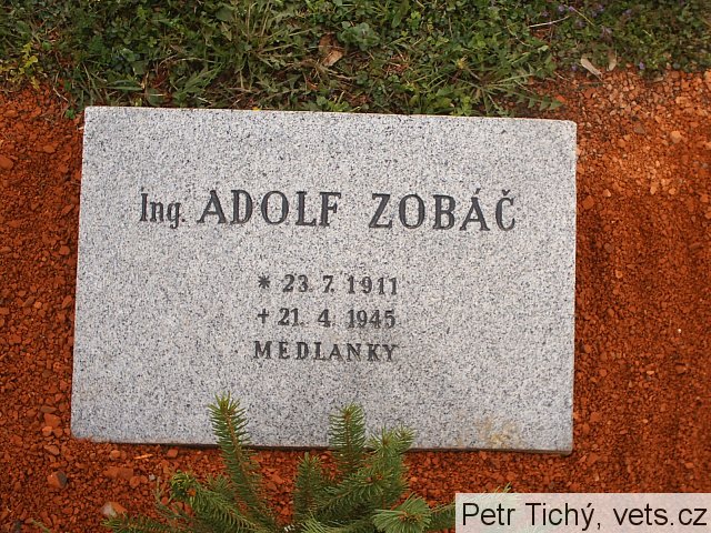 Ing. Dr. Adolf Zobáč, *23.7.1911 Lhota, okr. Nové Město na Moravě – †21.4.1945 Brno-Medlánky, bydliště Brno-Maloměřice, ulice V úzkých (dnes Těsná), vzdělání Státní reálka v Novém Městě na Moravě (1930 maturita), 1930–1934 Česká vysoká škola technická v Brně, odbor chemického inženýrství; Doktor technických věd in memoriam; zaměstnání 1938–1945 asistent ústavu analytické chemie, resp. chemické technologie Vysoké školy technické Dr. Edvarda Beneše v Brně, hrob č. 59