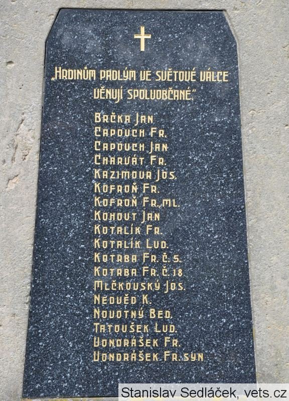 BRČKA JAN, CAPOUCH FR., CAPOUCH JAN, CARVÁT FR., KAZIMOUR JOS., KOFROŇ FR., KOFROŇ FR., ML., KOHOUT JAN, KOTALÍK R.,KOTALÍK LUD., KOTRBA FR. Č.5, KOTRBA FR. Č.18, MLČKOVSKÝ JOS., NEDVĚD K., NOVOTNÝ BED., TATOUŠEK LUD., VONDRÁŠEK FR., VONDRÁŠEK FR. SYN