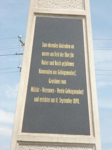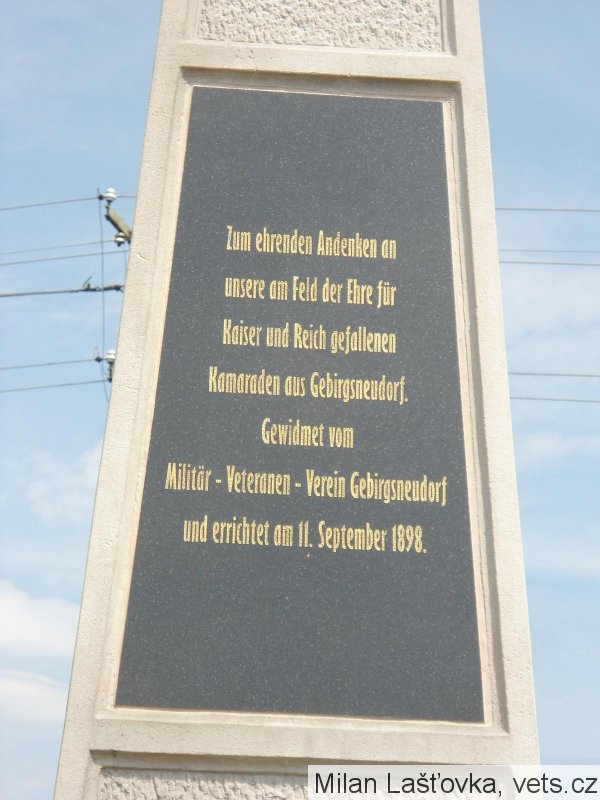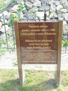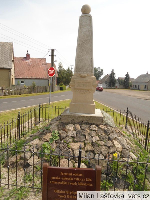 Tzv. "mikulovický válečný pomník" byl postaven na památku dvou místních obyvatel, kteří padli v bitvě u Hradce Králové (Königgrätz 1866), a byl vysvěcen 11.9.1898. Spolek válečných veteránů nechal v roce 1906 vybudovat okolo památníku trojúhelníkový parčík ohrazený plotem s řetězem. (zdroj databáze CEVH MO)