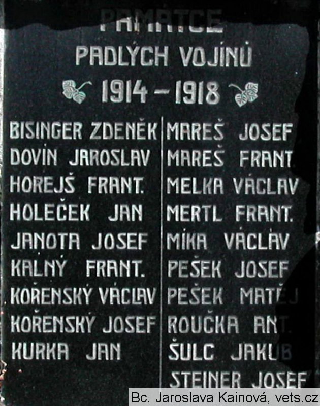 BISINGER ZDENĚK, DOVÍN JAROSLAV, HOREJŠ FRANT., HOLEČEK JAN, JANOTA JOSEF, KALNÝ FRANT., KOŘENSKÝ VÁCLAV, KOŘENSKÝ JOSEF, KURKA JAN, MAREŠ JOSEF, MAREŠ FRANT., MELKA VÁCLAV, MERTL FRANT., MÍKA VÁCLAV, PEŠEK JOSEF, PEŠEK MATĚJ, ROUČKA ANT., ŠULC JAKUB, STEINER JOSEF