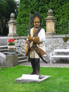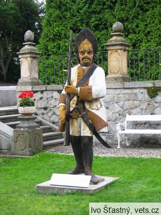 Socha rakouského granátníka, odlitá v komárovských železárnách.