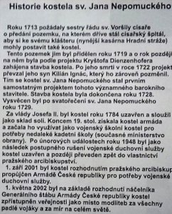 The church was built in 1729 as a part of the Ursulines´ convent. The construction of the church started in 1720, all works were conducted by a leading baroque architect Kilian Ignaz Dientzenhofer. The author of the frescoes was Wenzel Lorenz Reiner. The church was the first in Prague to be consecrated to st. John of Nepomuk.