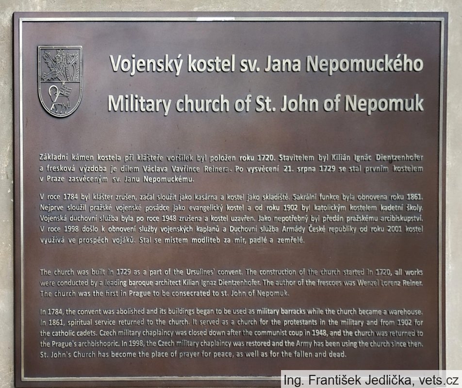 In 1784,the convent was abolished and its buildings began to be used as military barracks while the church became a warehouse. In 1861, spiritual service returned to the church. It served as a church for the protestants in the military and from 902 for the catholic cadets. Czech military chaplaincy was closed down after the communist coup in 1948, and the church was returned to the Prague´s arcibishopric. In 1998, the Czech military chaplaincy was restored and the Army has been using the church since then. St John´s Church has become the place of prayer for peace, as well as for the fallen and dead.