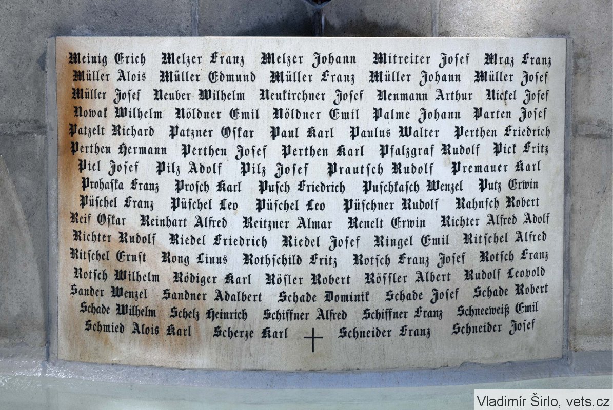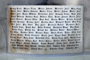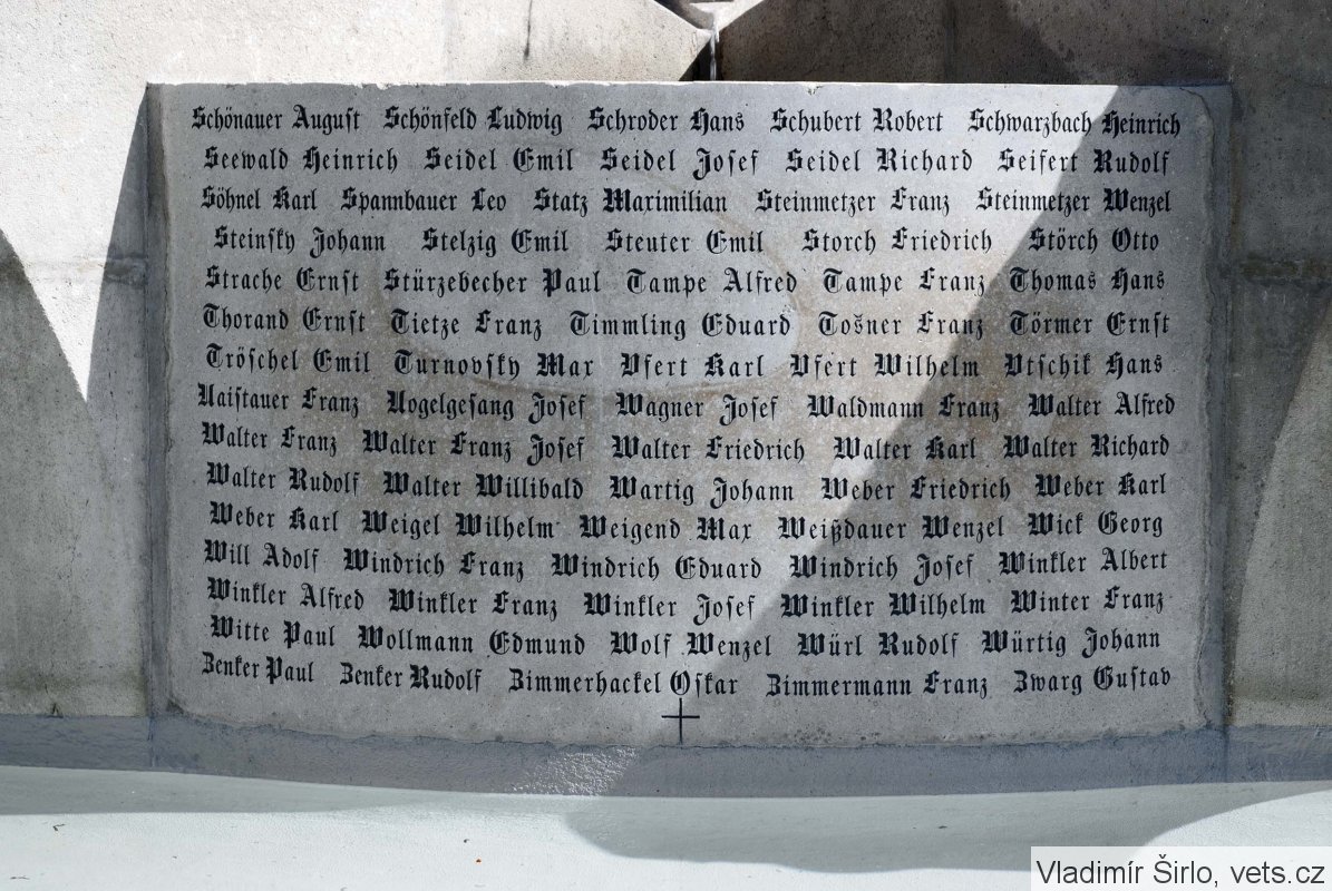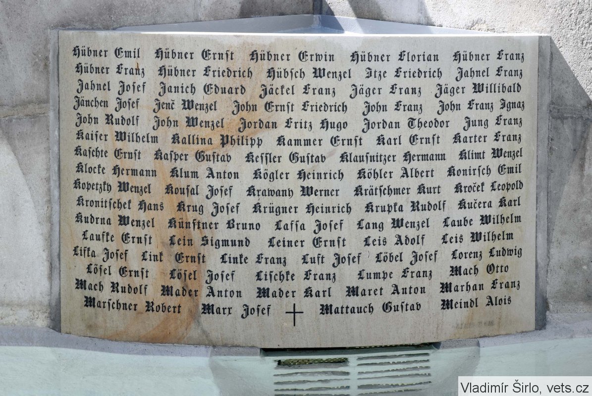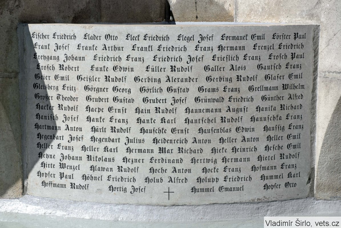 odhalen 09.09.1934, autor Fritz Tampe, po II. světové válce osekána jména padlých a desky překryty betonem, sochám těl vojáků uraženy hlavy. (zdroj databáze CEVH MO)