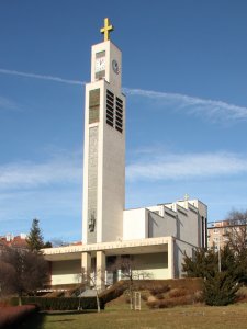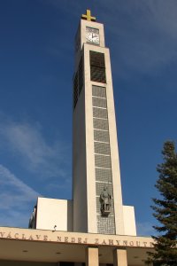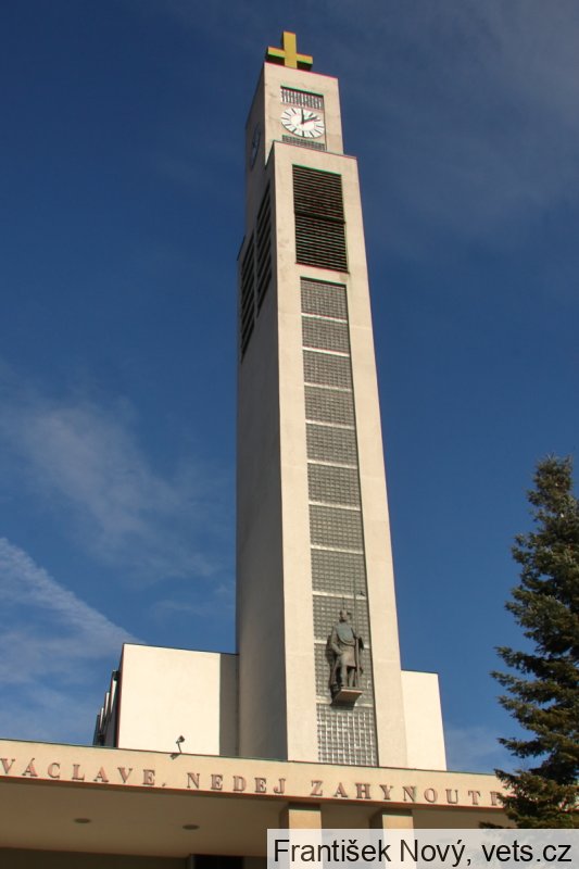 Umístění: Praha 10, náměstí Svatopluka Čecha, kostel sv. Václava, průčelí věžeNápis: