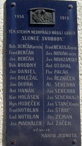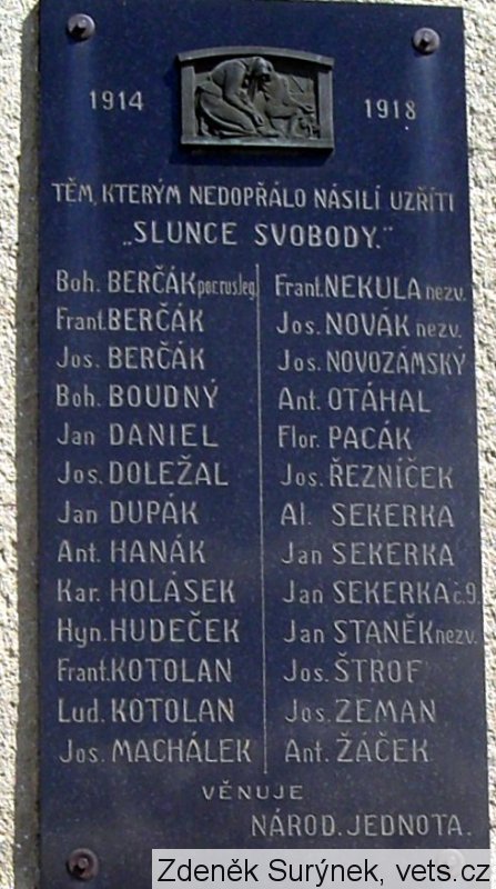 BOH. BERČÁK POR.RUS. LEG., FRANT. BERČÁK, JOS. BERČÁK, BOH. BOUDNÝ, JAN DÁNIEL, JOS. DOLEŽEL, JAN DUPÁK, ANT. HANÁK, KAR. HOLÁSEK, HYN. HUDEČEK, FRANT. KOTOLÁN, LUD. KOTOLÁN, JOS. MACHÁČEK, FRANT. NEKULA NEZV., JOS. NOVÁK NEZV., JOS. NOVOZÁMSKÝ,ANT. OTÁHAL, FLOR. PACÁK, JOS. ŘEZNÍČEK, AL. SEKERKA, JAN SEKERKA, JAN SEKERKA Č. 9., JAN STANĚK NEZV., JOS. ŠTROF, JOS. ZEMAN, ANT. ŽÁČEK