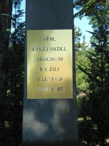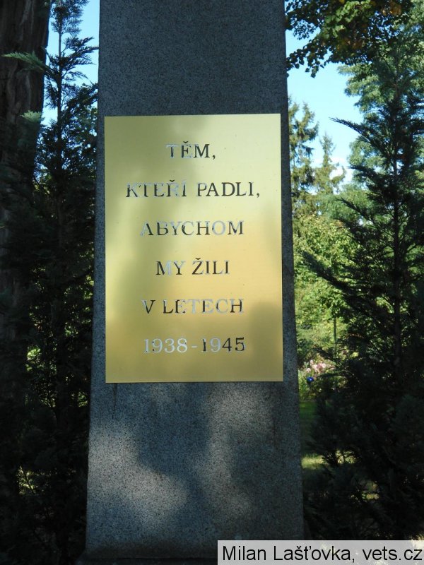 Památník v parku byl původně postaven již v prvních letech existence československého státu těm z místních mužů, kteří se nevrátili z bojišť první světové války. Proměna objektu v době po ukončení druhé světové války pak byla typickou reakcí nových českých dosídlenců na změněnou společensko -politickou situaci. Odhalení staronového pomníku na nějž byla z iniciativy místních komunistů instalována nová deska, s nápiesm: