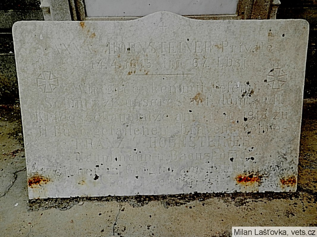 Před vypuknutím první světové války působil Franz Hornsteiner jako pedagog v soudním okrese Stod a naposledy jako učitel v severočeském Mostě. Když byla roku 1914 vyhlášena mobilizace, podrobil se odvodu a během následujících čtyř let bojoval v Haliči, Polsku, Rusku a Itálii. Během své služby obdržel několik válečných vyznamenání a povýšení. V roce 1918 je veden jako hejtman a velitel praporu císařskokrálovského 13. domobraneckého pěšího pluku, který v řadách rakousko-uherské 11. armády, dislokované tehdy na Planině sedmi obcí, sloužil i hejtman a velitel praporu domobrany Franz Hornsteiner. V pátek 11. října 1918, okolo čtvrté hodiny ranní, zasáhla Franze Hornsteinera střepina granátu do hlavy. Blatnický rodák padl v oblasti Il Buso, asi osm kilometrů východně od Asiaga.