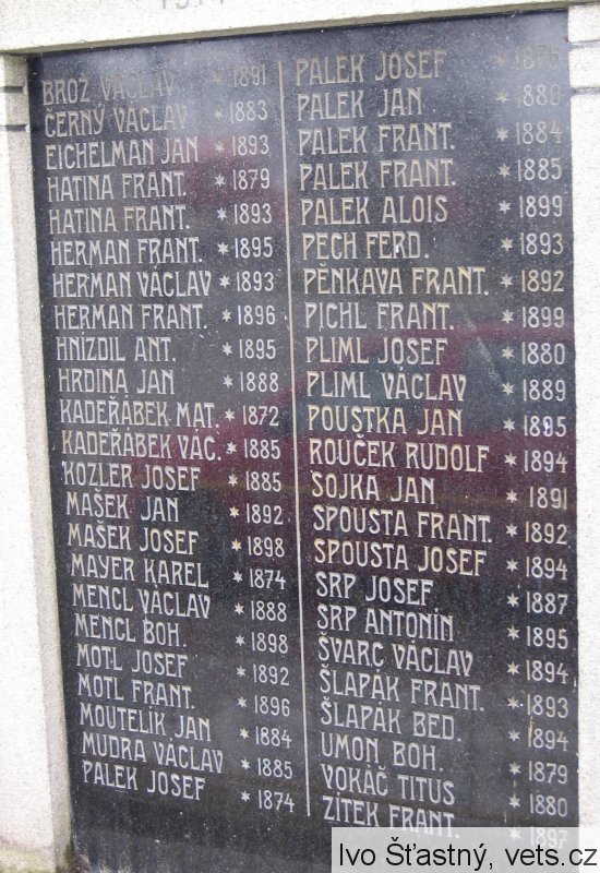 Brož Václav * 1891, Černý Václav * 1883, Eichelman Jan * 1893, Hatina Frant. * 1879, Hatina Frant. * 1895, Herman Frant. * 1895, Herman Václav * 1893, Herman Frant. * 1896, Hnízdil Ant. * 1895, Hrdina Jan * 1888, Kadeřábek Mat. * 1872, Kadeřábek Vác. * 1885, Kozler Josef * 1885, Mašek Jan * 1892, Mašek Josef * 1898, Mayer Karel * 1874, Mencl Václav * 1888, Motl Josef * 1892, Motl Frant. * 1896, Moutelík jan * 1884, Mudra Václav * 1885, Palek Josef * 1874, Palek Josef * 1876, Palek Jan * 1880, Palek Frant. * 1884, Palek Frant. * 1895, Palek Alois * 1899, Pech Ferd. * 1893, Pěnkava Frant. * 1892, Pichl Frant. * 1899, Pliml Josef * 1880, Pliml Václav * 1889, Poustka Jan * 1895, Rouček Rudolf * 1894, Sojka Jan * 1891, Spousta Frant. * 1892, Spousta Josef * 1894, Srp Josef * 1887, Srp Antonín * 1895, Švarc Václav * 1894, Šlapák Frant. * 1893, Šlapák Bed. * 1894, Umon Boh. * 1879, Vokáč Titus * 1880, Zítek Frant. * 1897