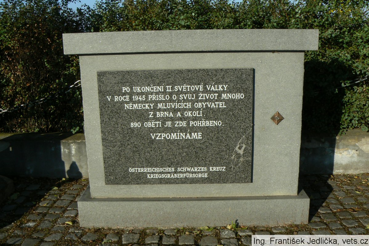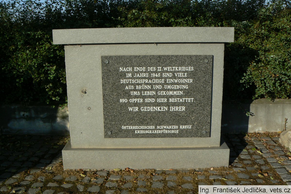 • Podle tvrzení českých historiků i místních obyvatel se zde žádný hrob, natož hrob masový, nenachází. 31. května 1945 pokračoval pochod směrem k Pohořelicím, na který osobně dohlíželi funkcionáři brněnského Národního výboru. Pro lidi, kteří byli unaveni, posedávali v příkopech a nemohli v závěru dne pokračovat v chůzi, byly poslány koňské povozy, které je odvezly do Pohořelic. Do 23. hodiny byli všichni umístěni v obytných prostorech, a to zejména v barákovém táboře, který zde za války zřídili němečtí okupanti pro nuceně nasazené Poláky. Dne 1. června bylo vybráno 10 000 Němců, kteří byli schopni pochodu do Rakouska. Tito pochodovali k Mikulovu, kde jejich pouť na českém území skončila. Vzhledem k tomu, že státní hranice v té době nebyla střežena, vysídlenci se po vyčkávání rozhodli k jejímu postupnému překračování do Rakouska. Přitom bylo na rakouské straně složeno několik mrtvých brněnských Němců.