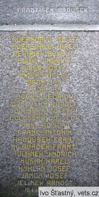 FRANTIŠEK JIROUŠEK, AUERSWALD JOSEF, AEURSWALD KAREL, BERÁNEK BOHUMIL, BIBER JOSEF, BIBER VÁCLAV, BROM JAN, ČUDA JAN, DOBRÝ BEDŘICH, DOLEJŠKA RUDOLF, DOLEJŠKA VOJTĚCH, DOLEJŠKA VOJTĚCH, FINK LADISLAV, FRANC ANTONÍN, HANOUSEK FRANT., HLAVÁČEK FRANT., HOLÁNEK JINDŘICH, HUSÁK KAREL, HYHLAN JOSEF, JANDA JOSEF, JELÍNEK ARNOŠT, JELÍNEK JAN, JELÍNEK JOSEF, KOCOUREK JAROSLAV, KOŘÍNEK FRANT., KOŘÍNEK JOSEF, KOURA KAREL, KROUŽIL ALOIS, KROUŽIL VÁCLAV, KŘÍŽALA JOSEF, LEBDUŠKA FRANT., LINHART ANTONÍN, MYSLIVEC VÁCLAV, NĚMEC FRANT., NĚMEC JOSEF, NESLÁDEK BOHUMIL, PAVLÍK VÁCLAV, PECA FRANTIŠEK, POKORNÝ FRANT., POSPÍŠIL ČENĚK, POSPÍŠIL VÁCLAV, PROCHÁZKA JOSEF, PROCHÁZKA RUDOLF, LEBEDA JOSEF, RAJZÍK JOSEF, SLAVÍK ANTONÍN, SLAVÍK KAREL, SLAVÍK VÁCLAV, SOCHŮREK VÁCLAV, SCHREIBER JOSEF, ŠEVČÍK JOSEF, ŠIROKÝ JOSEF, ŠNAJDRVINT JAN, ŠPINKA ANTONÍN, ŠTAJNC FRANTIŠEK, ŠTOČEK EDUARD, ŠVADLEŇÁK BOHUMIL, TÁBORSKÝ JOSEF, TLAMKA ANTONÍN, UŘÍDIL KAREL, VESELÝ JOSEF, VOJTÍŠEK EMANUEL, VOZÁR FRANTIŠEK, VOZÁR JOSEF, ZAJÍC ALOIS, ZAJÍC JOSEF