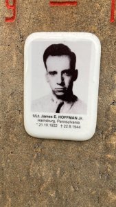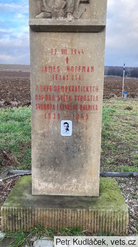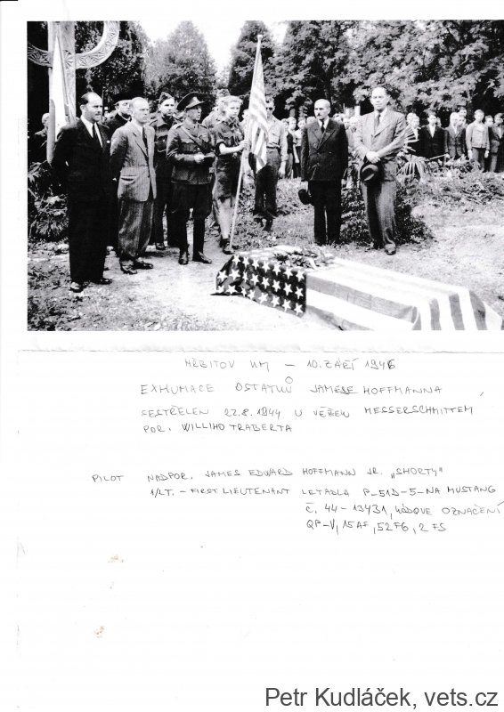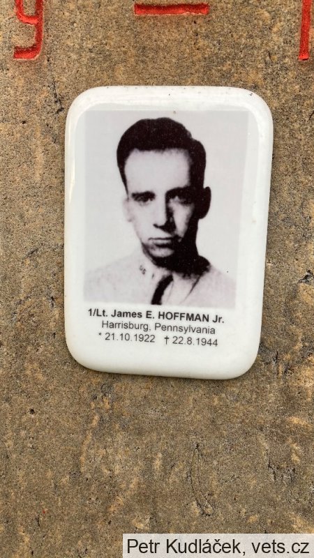 1/Lt. James E. Hoffman Jr vstoupil do armády v roce 1942 a operačně létal od počátku roku 1944. Od května do července 1944 dosáhl 6,5 uznaných sestřelů. Dne 24. srpna 1944 byl pohřben na hřbitově v Kroměříži. Dne 10.9.1946 byly jeho ostatky exhumovány (foto z exhumace přiloženo) a převezeny do Francie, a poté do rodné Pennsylvanie. (Zdroj: deník.cz, Bitva leteckých es nad Kroměřížskem, od které uplynulo už 70 let)