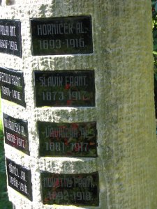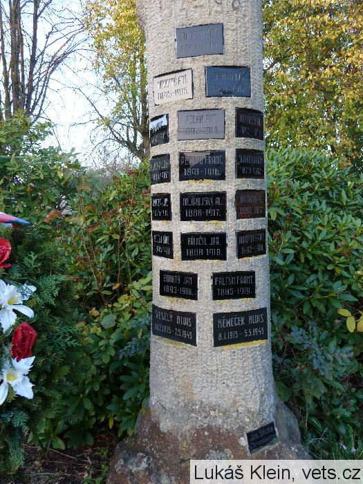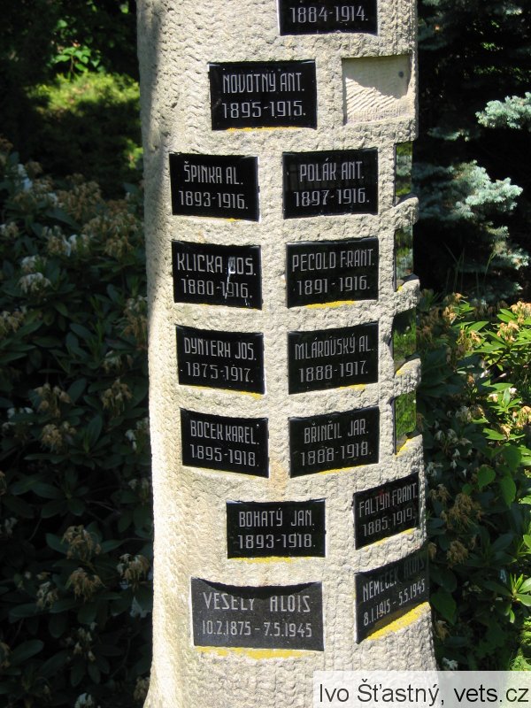 VODIČKA ANT. 1884 – 1914, NOVOTNÝ ANT. 1895 – 1915, ŠPINKA ANT. 1891 – 1915, ŠPINKA AL. 1893 – 1916, POLÁK ANT. 1897 – 1916, HORNÍČEK 1893 – 1916, KLIČKA JOS. 1880 – 1916, PECOLD FRANT. 1891 – 1916, SLAVÍK FRANT. 1873 – 1917, DYNTERA JOS. 1875 – 1917, MLÁROVSKÝ AL. 1888 – 1917, VAVŘIČKA AL. 1881 – 1917, BOČEK KAREL 1895 – 1918, BŘINČIL JAR. 1888 – 1918, NOVOTNÝ FRANT. 1892 – 1918, BOHATÝ JAN 1893 – 1918, FALTÝN FRANT. 1885 – 1919