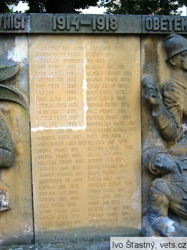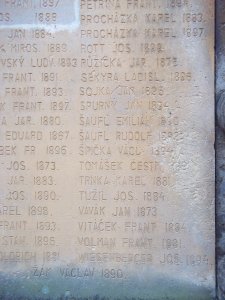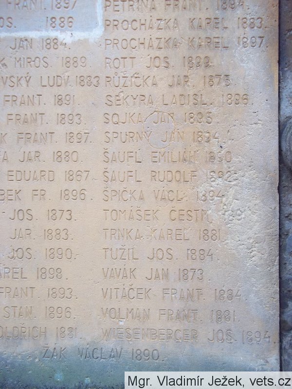 ČERMÁK ALOIS 1885, KUNÍK FRANTIŠEK RUSKÝ LEGIONÁŘ 1892, ŠTURMA FRANT. FRANCOUZSKÝ LEGIONÁŘ 1894, VITÁČEK JIŘÍ STARODRUŽINÍK 1890, ANÝŽ FRANT. 1893, BAUR JOSEF 1894, BERDYCH JOS. 1892, BRET PETR 1895, ČAJ JAN 1880, ČIHÁK ALOIS 1885, DREMLA LUDVÍK 1874, HÁJEK JOS. 1892, HAMOUZ FRANT. 1897, HUML JOS. 1886, HEPNER JAN 1884, HLOUŠEK MIROS. 1889, HNĚVKOVSKÝ LUDV. 1883, HNIDEK FRANT. 1891, HNÍZDIL FRANT. 1893, HOLEČEK FRANT. 1897, JEDLIČKA JAR. 1880, JERNEK EDUARD 1867, KADEŘÁBEK FR. 1896, KOCMAN JOS. 1873, KŘÍKAVA JAR. 1883, KŘÍKAVA JOS. 1890, KULT KAREL 1898, KUNÍK FRANT. 1893, LHOTÁK STAN. 1896, LUKÁŠ OLDŘICH 1881, NEJEDLÝ ANT. 1881, NEJEDLÝ EDUARD 1882, NEUMAN FRANT.1875, NOVÁK ADOLF 1895, NOVÝ KAREL 1878, NOVÝ LUDVÍK 1886, OBRMAN ČENĚK 1873, PELC FRANT. 1894, PETŘINA FRANT. 1894, PROCHÁZKA KAREL 1883, PROCHÁZKA KAREL 1897, ROTT JOS. 1899, RŮŽIČKA JAR. 1875, SEKYRA LADISL. 1896, SOJKA JAN 1895, SPURNÝ JAN 1894, ŠAUFL EMILIÁN 1890, ŠAUFL RUDOLF 1892, ŠPIČKA VÁCL. 1894, TOMÁŠEK ČESTM. 1891, TRNKA KAREL 1881, TUŽIL JOS. 1884, VAVÁK JAN 1873, VITÁČEK FRANT. 1884, VOLMAN FRANT. 1881, WIESENBERGER JOS. 1894, ŽÁK VÁCLAV 1890