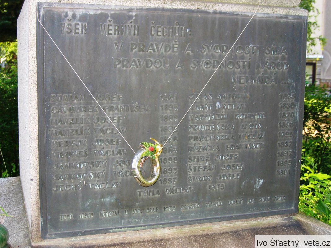 Burian Josef 1881, Cafourek František 1895, Hanzlík Josef 1892, Hanzlík Václav 1892, Herejk Josef 1878, Hroneš Václav 1884, Jankovský Josef 1899, Jankovský Václav 1893, Ječný Václav 1897, Jiras Antonín 1893, Kabát Václav 1888, Karmazín Bohumil 1878, Procházka Alois 1898, Procházka Václav 1895, Růžička František 1887, Smrž Josef 1897, Štěpán Josef 1895, Štěpán Josef 1895, Švarc Josef 1891, Tůma Václav 1873