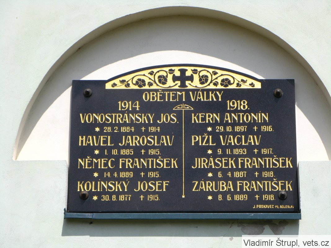 VONOSTRÁNSKY JOS. *28.2.1884 +1914, HAVEL JAROSLAV, *1.10.1885 +1915, NĚMEC FRANTIŠEK *14.4.1889 +1915, KOLÍNSKÝ JOSEF *30.8.1877 +1915, KERN ANTONÍN *29.10.1897 +1916, PIŽL VÁCLAV *9.11.1893 +1917, JIRÁSEK FRANTIŠEK *6.4.1887 +1918, ZÁRUBA FRANTIŠEK *8.6.1889 +1918