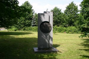 b) Na teracovém soklu s obrazem 2 vězňů při práci v kamenolomu je umístěný náhrobek s vytesanými jmény. Na věčnou památku věnovali kamarádi z koncentračních táborů a místní občané těm, kteří se nevrátili.