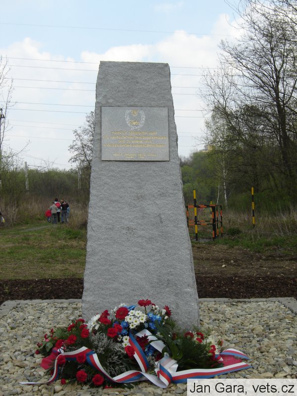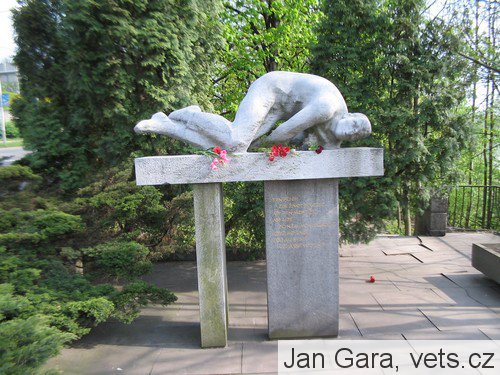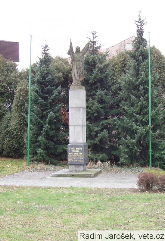 Pomník od akad. sochaře R. Vávry, který byl slavnostně odhalen 6. května 1951; na vrcholu vysokého kvádru, obloženého mramorovými deskami, je alegorická postava Vítězství; po stranách vysoké kovové vlajkové stožáry.