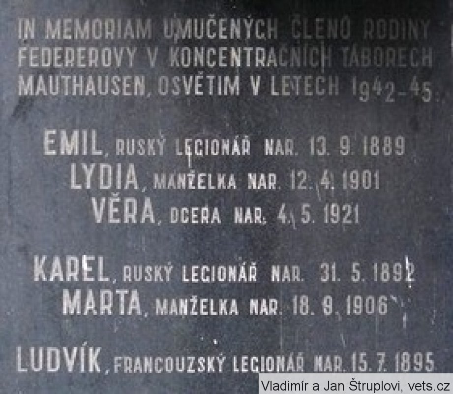 Federer Emil, nar. 13.9.1889, Mladá Boleslav. V RU armádě sloužil u 36. pěšího pluku jako vojín. Zajat 25.8.1914, Žolkiev. Do ČS legií v Rusku se přihlásil v Petropavlovsku, Akmolinsk. Zařazen 12.10.1917 jako vojín 5. střeleckého pluku. Demobilizován 2.8.1920 jako četař centrokomise. Manželka Lydie, nar. 1891, Suvalky. V legiích od 12.10.1917 do 23.4.1920.