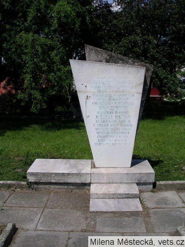 Na místě, kde stojí pomník byla zastřelena dne 8.3.1945 13-letá školačka Milena Hážová. První verze říká, že podala chléb jednomu z právě procházející řady zbědovaných sovětských válečných zajatců a strážný ji proto zastřelil. Podle druhé verze chtěl hladový zajatec kolemjdoucí dívce vytrhnout tašku s nákupem a strážného kulka omylem dívku zasáhla.