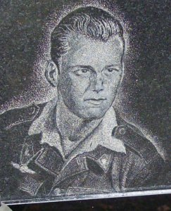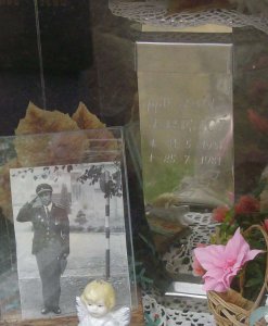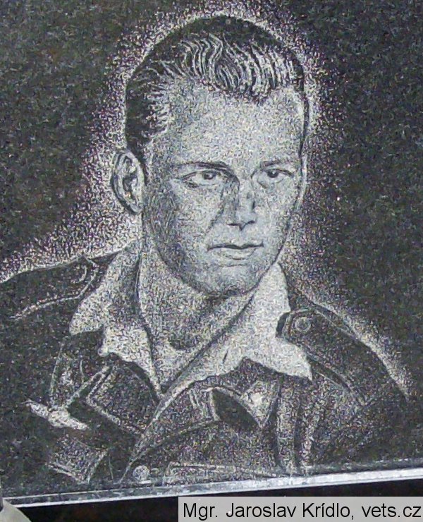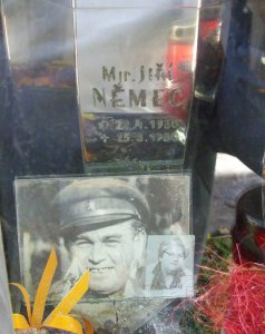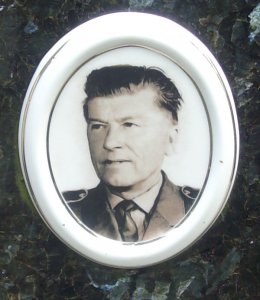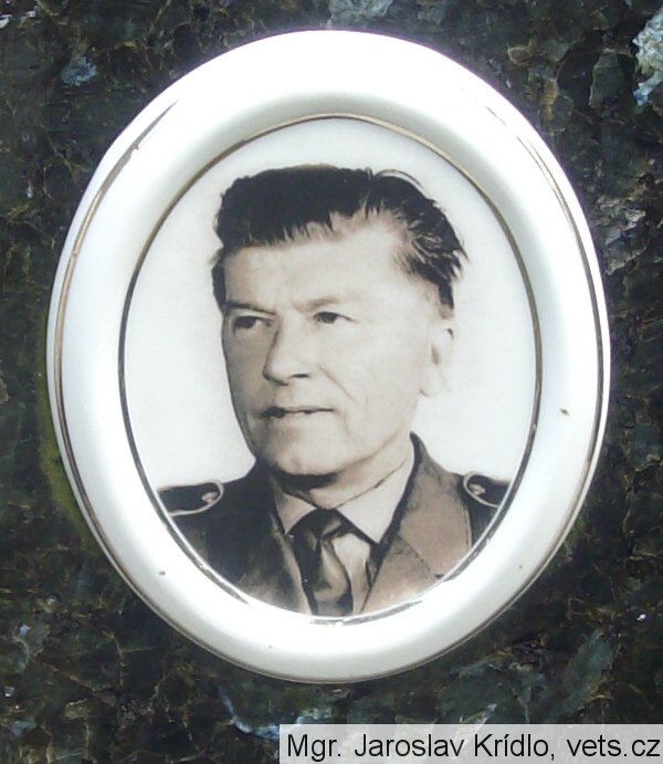 náhrobek s vyobrazením vojáka, v uniformě příslušníka československé lidové armády, specialisty 2. třídy, s blíže nečitelnou specializací na límci saka