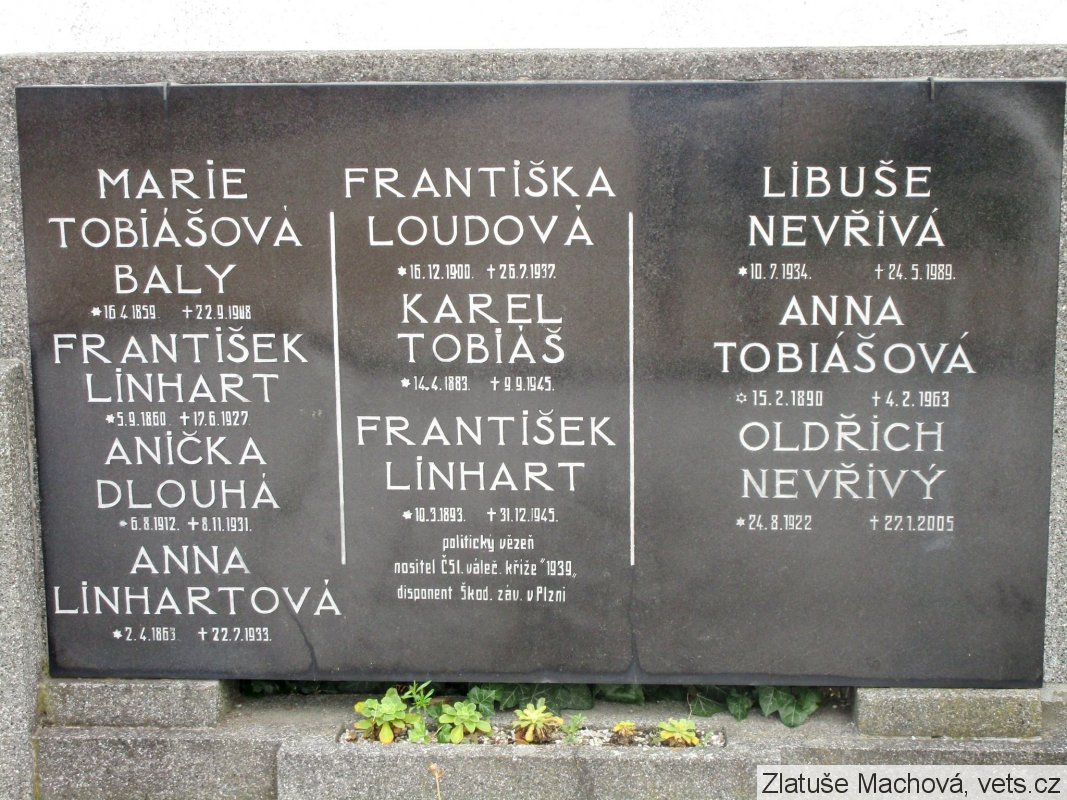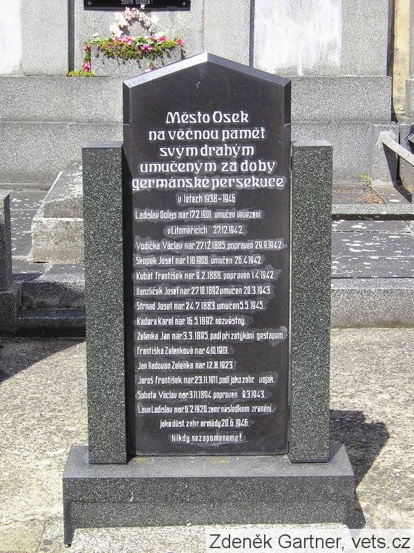 LADISLAV DOLEJŠ *17.2.1901. UMUČEN VE VĚZENÍ V LITOMĚŘICÍCH 27.12.1942., VODIČKA VÁCLAV *27.12.1885. POPRAVEN 29.9.1942., ŠKOPEK JOSEF *1.10.1908. UMUČEN 26.4.1942., KUBÁT FRANTIŠEK *9.2.1888. POPRAVEN 1.4.1942., HANZLÍČEK JOSEF *27.10.1892. UMUČEN 20.3.1943., STRNAD JOSEF *24.7.1883. UMUČEN 5.5.1945., KODORA KAREL *16.5.1892. NEZVĚSTNÝ., ZELENKA JAN *3.3.1895. PADL PŘI ZATÝKÁNÍ GESTAPEM., FRANTIŠKA ZELENKOVÁ *4.10.1901., JAN RADOVAN ZELENKA *12.8.1923., JAROŠ FRANTIŠEK *23.11.1911. PADL JAKO ZAHR. VOJAK., SOBOTA VÁCLAV *3.11.1894. POPRAVEN 9.3.1943., LAUN LADISLAV *6.2.1920. ZEMŘ. NÁSLEDKEM ZRANĚNÍ. JAKO DŮST. ZAHR. ARMÁDY 20.6.1946., NIKDY NEZAPOMENEME!
