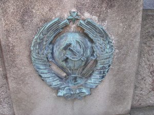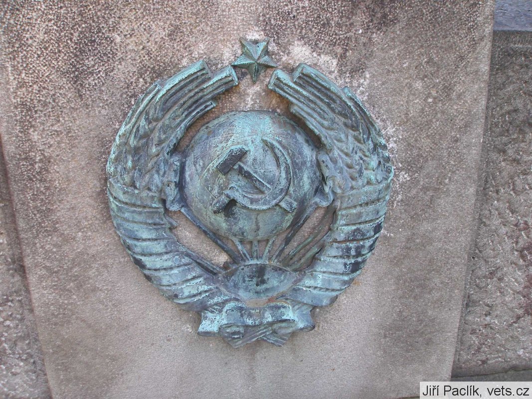 K pomníku náleží dva osově souměrné nosiče na pochodně (zřejmě), které jsou zdobeny znaky SSSR.