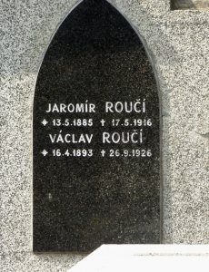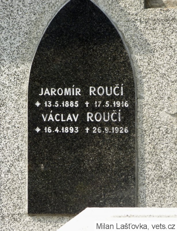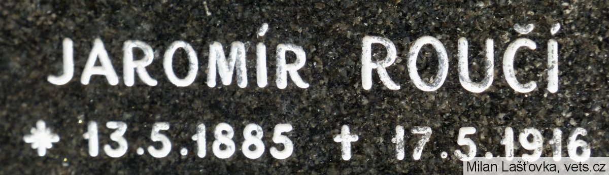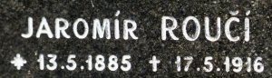 Roučí Jaromír: strážmistr býv. vojen. prap. č.9. *1885 Úhonice - Kladno. +17./5.1916 Josefov - Dvůr Král.n.L. Pohřben 21./5.1916 na hřbitově v Úhonicích