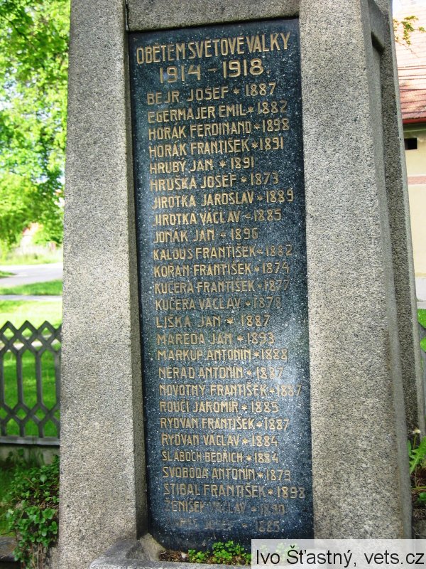 Bejr Josef *1887, Egermajer Emil *1882, Horák Ferdinand *1898, Horák František *1891, Hrubý Jan *1891, Hruška Josef *1873, Jirotka Jaroslav *1889, Jirotka Václav *1885, Jonák Jan *1896, Kalous František *1882, Kořán František *1874, Kučera František *1874, Kučera Václav *1878, Liška Jan *1887, Mareda Jan *1893, Markup Antonín *1888, Nerad Antonín *1887, Novotný František *1887, Roučl Jaromír *1885, Rydvan František *1887, Rydvan Václav *1884, Slaboch Bedřich *1884, Svoboda Antonín *1879, Stibal František * 1898, Ženíšek Václav *1890, Karas Josef *1885