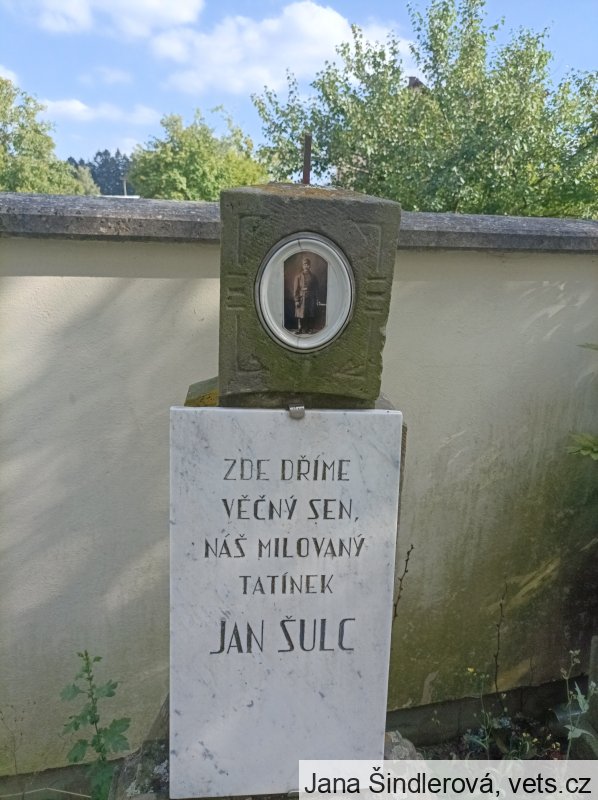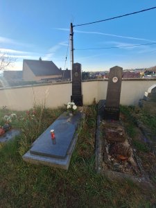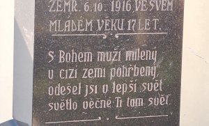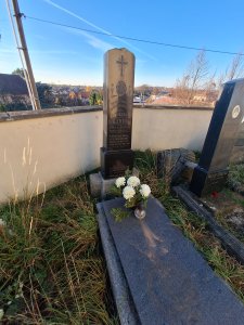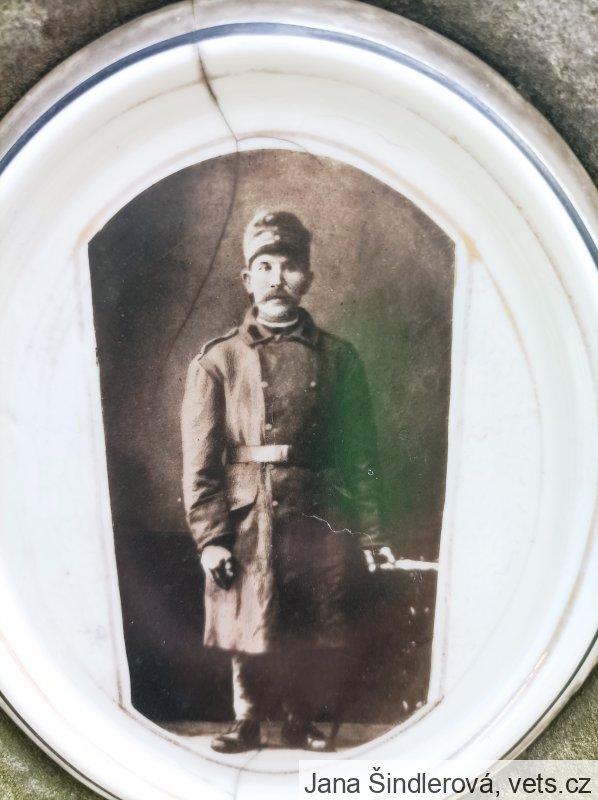 foto vojáka v c. a k. uniformě, hrob u zdi za kostelem