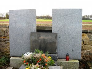 Nápis na starší desce, odložené za pomníkem: