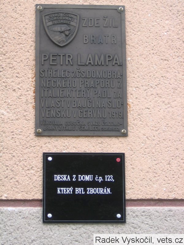 V levém horním rohu horní desky je znak Svazu čsl. domobrany z Itálie. Připojena spodní deska s informací o původním umístění pamětní desky.