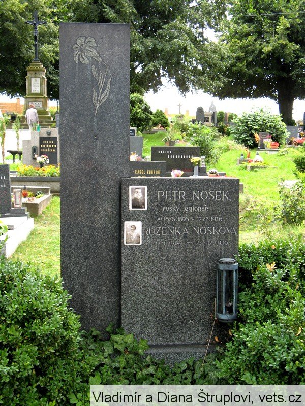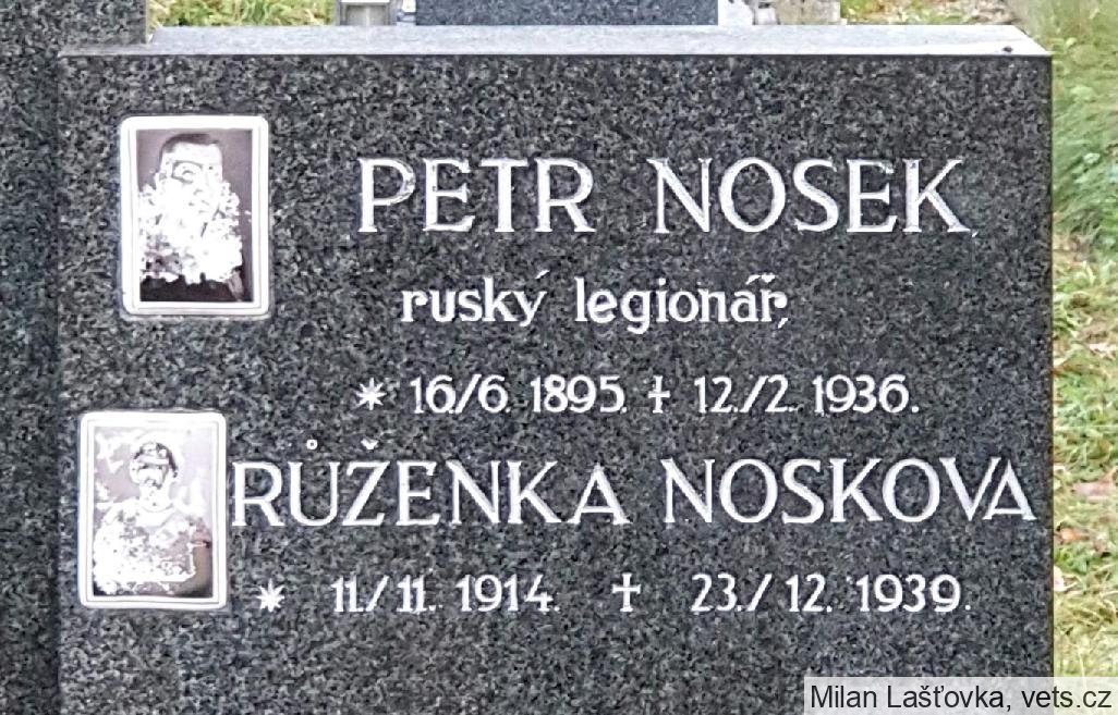 Nosek Petr, nar. 29.6.1895, Boskov. V RU armádě sloužil od r. 1915 u 11. zeměbraneckého pěšího pluku. Zajat 27.7.1917. Do ČS legií v Rusku se přihlásil 2.10.1917, Kosaja Hora. Zařazen 12.10.1917 jako vojín k 4. střeleckému pluku. Dnem 30.7.1919 neschopen služby. (zdroj databáze VÚA Praha)