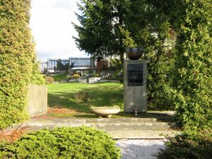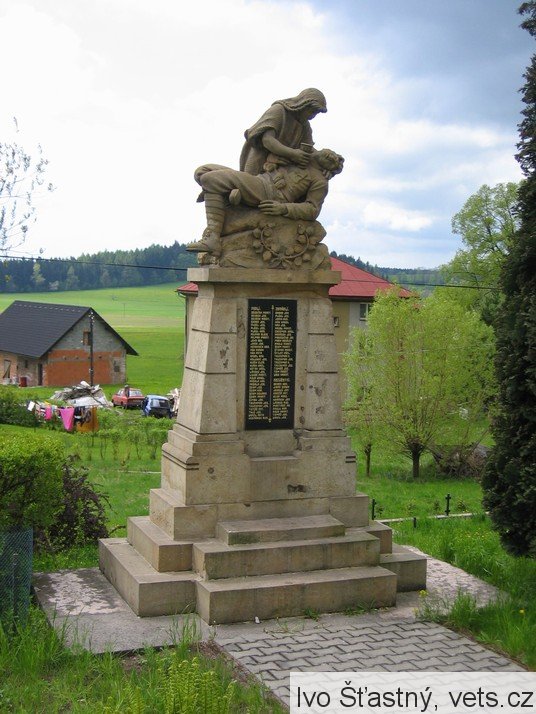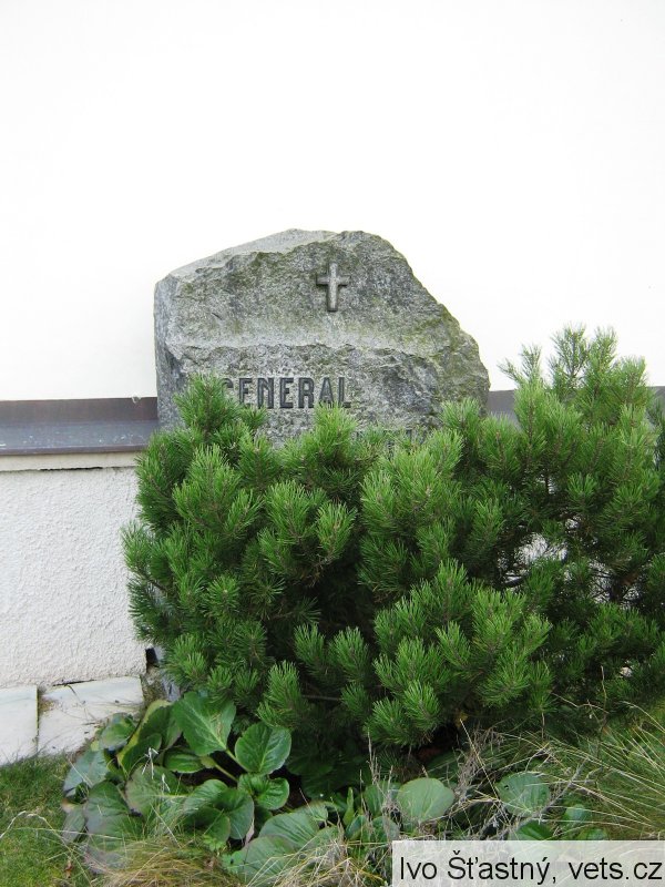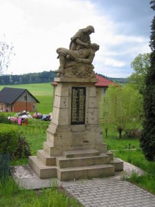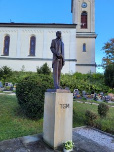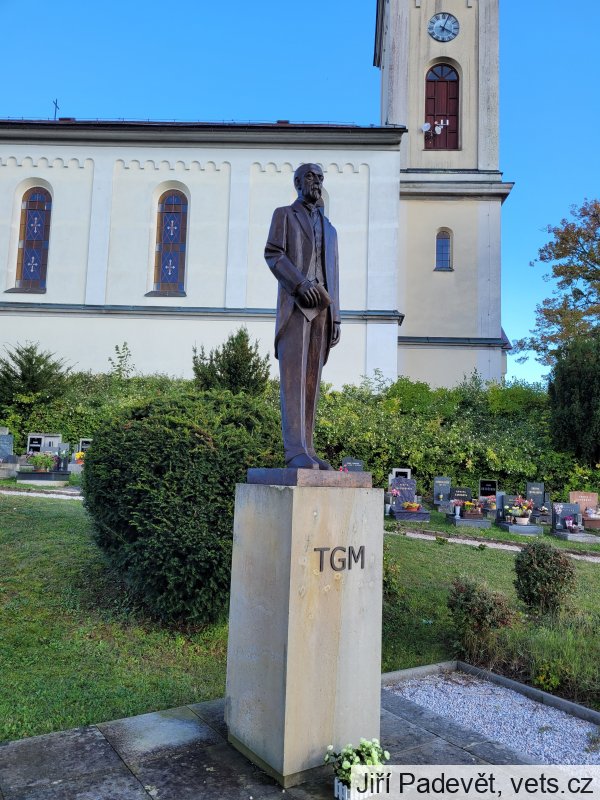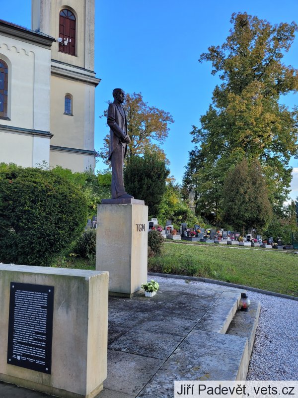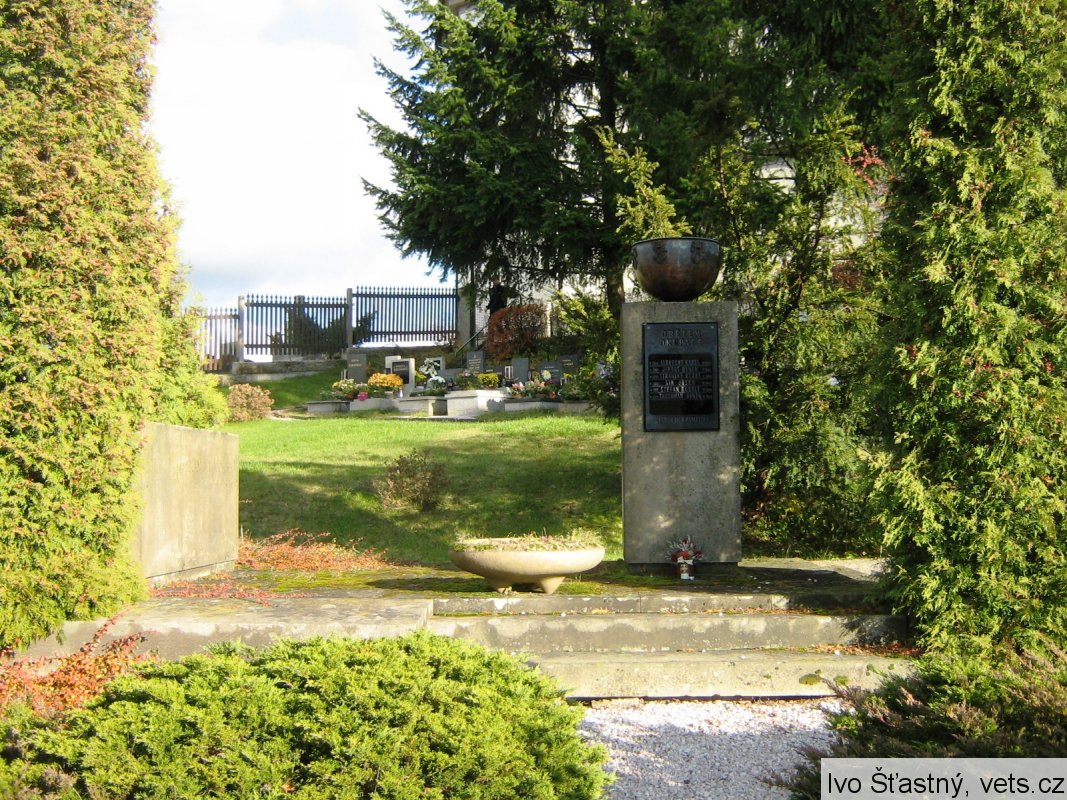 Západně od kostela sv. Jana Křtitele v části hřbitova určené pro urnové hroby je upravené prostranství s pomníkem. Na pískovcové základné desce, částečně přístupné po stupních je instalován vysoký podstavec pod sochu T. G. M. a na okraji této plochy je pak instalován menší blok s deskou připomínající jména obětí okupace. Blok je rovněž ze žlutého pískovce, deska na něm je skleněná černá s pískovanými nápisy.