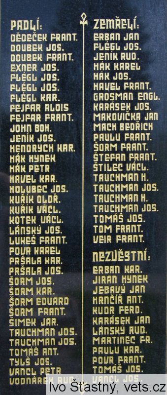 DĚDEČEK FRANT., DOUBEK JOS., DOUBEK FRANT., EXNER JOS., FLÉGL JOS., FLÉGL JOS., FLÉGL KAR., FEJFAR ALOIS, FEJFAR FRANT., JOHN BOH., JENÍK JOS., HENDRYCH KAR., HÁK HYNEK, HÁK PETR, HAVEL KAR., HOLUBEC JOS., KUŘÍK OLDŘ., KUŘÍK VÁCL., KOTEK VÁCL., LÁNSKÝ JOS., LUKEŠ FRANT., POUR KAREL, PRŠALA KAR., PRŠALA JOS., ŠORM JOS., ŠORM KAR., ŠORM EDUARD, ŠORM FRANT., ŠIMEK JAR., TAUCHMAN JOS., TOMÁŠ ANT., TYLŠ JOS., VANCL PETR, VODNÁREK RUD.