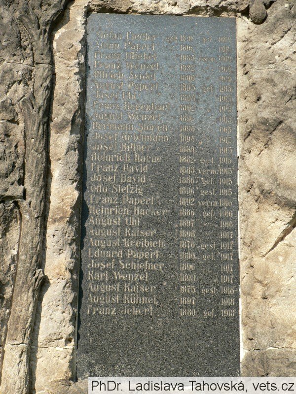 Stefan Fiedler geb. 1891, gef. 1914, Anton Papert geb. 1891, ges. 1914, Franz Michel geb. 1885 verm. 1914, Franz Wenzel geb. 1882 verm. 1914, Ulrich Seidel geb. 1890 verm. 1914, August Papert geb. 1890 gef. 1915, Josef Uhl ges. 1894 gef. 1915, Franz Hegenbart ges. 1892 gef. 1915, August Wenzel ges. 1891 gef. 1915, Hermann Storch ges. 1896 gef. 1915, Josef Grohmann ges. 1894 gef. 1915, Josef Bittner ges. 1884 gef. 1915, Heinrich Mache ges. 1882 gest. 1915, Franz David ges. 1883 verm. 1915, Josef David ges. 1886 gef. 1915, Otto Stelzig ges. 1896 gest. 1915, Franz Papert ges. 1892 verm. 1916, Heinrich Hacker ges. 1886 gef. 1916, August Uhl ges. 1897 gef. 1916, August Kaiser ges. 1898 gef. 1917, August Kreibich ges. 1876 gest. 1917, Eduard Papert ges. 1880 gef. 1917, Josef Schiefner ges. 1896 gef. 1917, Karl Wenzel ges. 1898 gef. 1917, August Kaiser ges. 1875 gest. 1918, August Kühnel ges. 1897 gest. 1918, Franz Jockert ges. 1880 gef. 1918