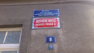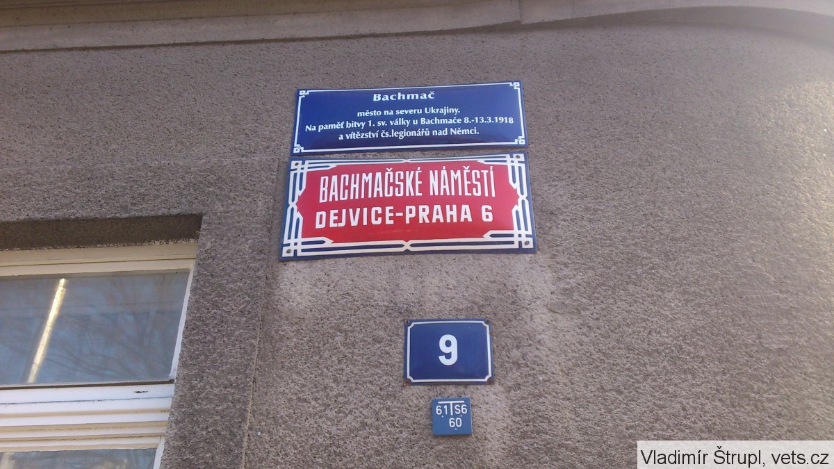 Umístění: Praha 6, Bachmačské náměstí 297/8, Dům č.p. 297 k.ú. Dejvice je evidován se dvěma orientacemi - s č.o. 10 do Václavkovy ulice, s č.o. 8 do Bachmačského náměstí, přičemž adresní bod do náměstí je uváděn bez vchodu.K nesprávnému osazení tabulky s č.o. 9 došlo pravděpodobně omylem - toto číslo odpovídá číslování ulice (sudá a lichá čísla zvlášť), nikoliv náměstí (číslování za sebou). Čísla orientační 6 a 7 jsou na dané straně náměstí osazena správně.
