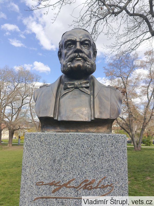 (nápisy na deskách za sochou, zleva)