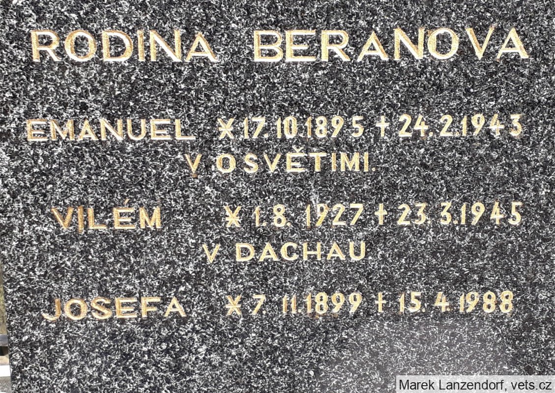 Vilém Beran, poslední bydliště před deportací Polička, Adresa/místo registrace v Protektorátu Polička, Transport Dc, č. 65 (9. 6. 1943, Praha-Terezín). Transport Ek, č. 2356 (28. 9. 1944, Terezín-Osvětim). Zahynul 23. 3. 1945 Dachau.