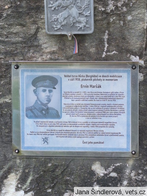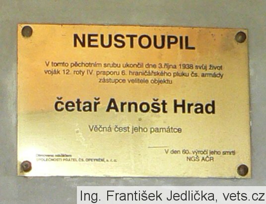 Četař Arnošt Hrad, 24 letý poddůstojník, rodák z Prahy, zástupce velitele pěchotního srubu S-14, se 3. října 1938 smrtelně zranil služební pistolí na protest proti předání našeho pohraničního opevnění německému velení bez boje podle podmínek mnichovského diktátu. Ve 23.20 hod. zemřel v nemocnici v Červené Vodě. U smrtelně zraněného četaře byly nalezeny 3 dopisy na rozloučenou (mamince, veliteli 12. roty a kamarádům, vojákům). Odhalení pamětní desky tomuto hrdinovi provedl Generální štáb České armády za účasti generálmajora Nekvasila, čestné jednotky, vojenské hudby, zástupců města Králíky a veřejnosti dne 2. 10. 1994. Dlouho zde však nevydržela a vandalové ji zničili. Proto byla znovuodhalena 2. 10. 1998 za přítomnosti Hradní stráže a mnoha čestných hostů - mezi nimiž byl i velitel vojska územní obrany generálmajor Petr Voznica a generálporučík Radovan Procházka. (zdroj databáze CEVH MO ČR)