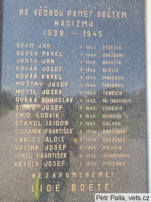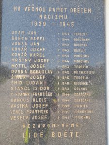 KOUBA FRANTIŠEK 1898-1918, KRÁTKÝ JOSEF 1884-1918, KVAPIL JINDŘICH 1895-1915, LNĚNIČKA JOSEF 1886-1918, MÜLLER ANTONÍN 1868-1918, MÜLLER JINDŘICH 1893-1915, PACHL ALOIS 1876-1915, PAUKERT EDUARD 1887-1915, POSPÍŠIL HYNEK 1887-1917, RESLER JAN 1896-1915, RYBKA LUDVÍK 1896-1915, ŘEHÁK ČENĚK 1893-1918, ŘEPÁŠEK JOSEF 1890-1915, STRÁNSKÝ ANTONÍN 1893-1915, SLEZÁK JOSEF 1893-1914, SIGL JAN 1896-1918, SMÍTIL JAN 1897-1917, ŠPATENKA JOSEF 1895-1915, ŠPATENKA FRANTIŠEK 1872-1917, TASNER JAN 1893-1917, TOMEŠ FRANTIŠEK 1886-1915, TOMEŠ FRANTIŠEK 1898-1917, UMA ALOIS 1875-1918, VÁPENKA LUDVÍK 1880-1916, VÍTEK JOSEF 1873-1918, VENCL STANISLAV 1894-1917, ZOUBELE JOSEF 1876-1916