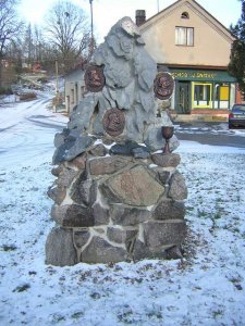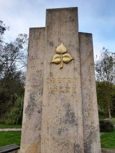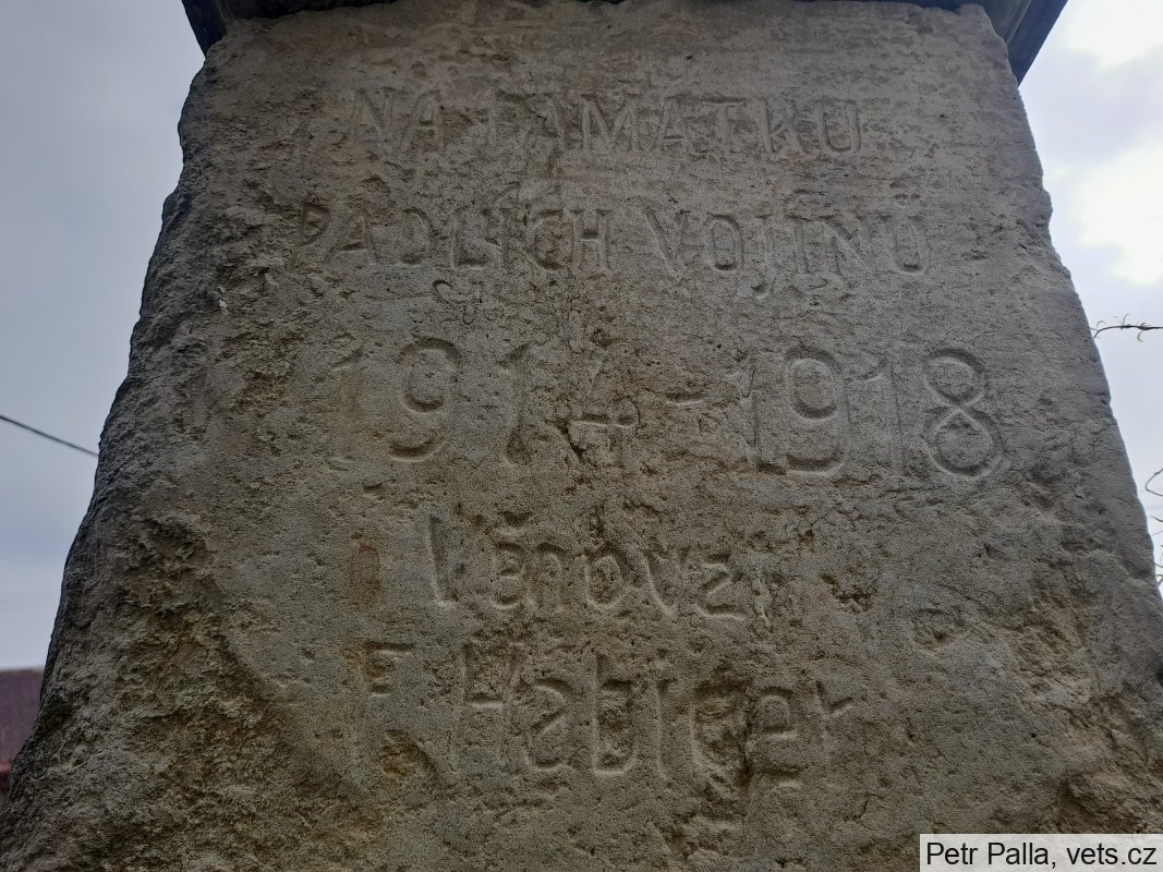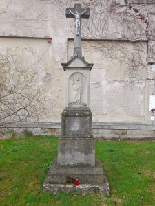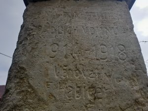 kamenný kříž z roku 1924, vystaven k poctě padlých vojáků s nápisem na zadní straně.