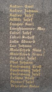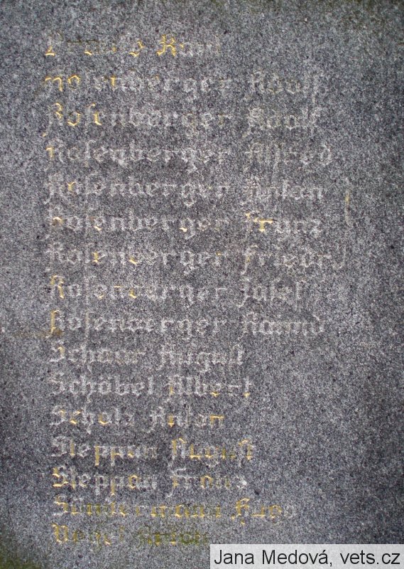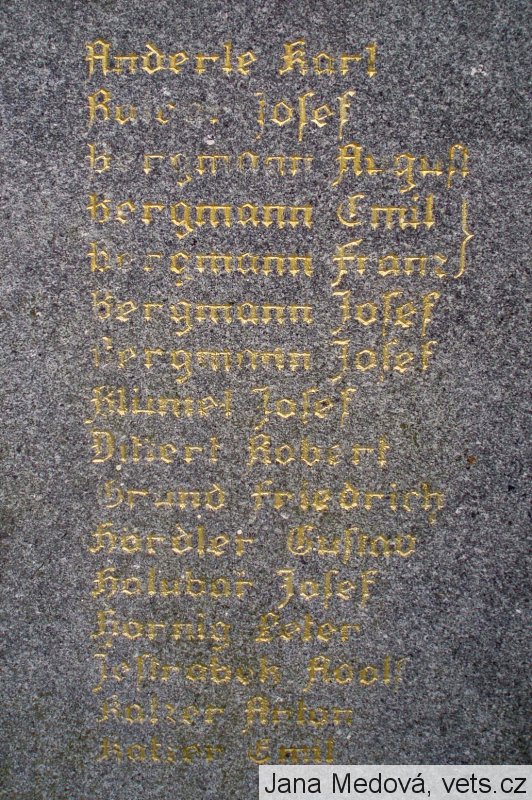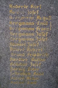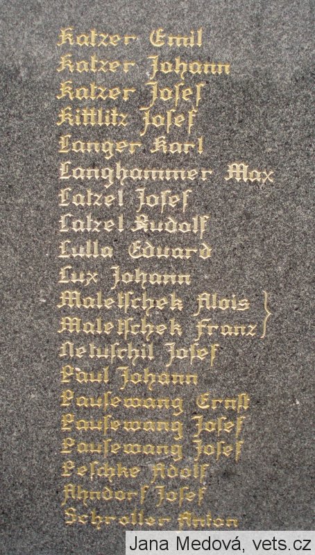 Anderle Karl, Balcar Josef, Bergmann August, Bergmann Emil, Bergmann Franz, Bergmann Josef, Bergmann Josef, Blümel Josef, Dittert Robert, Grund Friedrich, Hördler Gustav, Holubar Josef, Hornig Peter, Jestrabek Adolf, Katzer Anton, Katzer Emil, Emil Katzer, Katzer Johan, Katzer Josef, Kittlitz Josef, Langer Karl, Langhammer Max, Latzel Josef, Latzel Rudolf, Lulla Eduard, Lux Johann, Maletschek Alois, Maletschek Franz, Netuschil Josef, Paul Johann, Pausemang Ernst, Pausemang Josef, Pausemang Josef, Pelchke Adolf, Ahndorf Josef, Schroller Anton, ??? Karl, Rosenberger Adolf, Rosenberger Adolf, Rosenberger Alfred, Rosenberger Franz, Rosenberger Friedr., Rosenberger Josef, Rosenberger Rai., Schom August, Schöbel Albert, Scholz Anton, Steppan August, Steppan Franz, Sindermann Hugo, Vogel Anton.