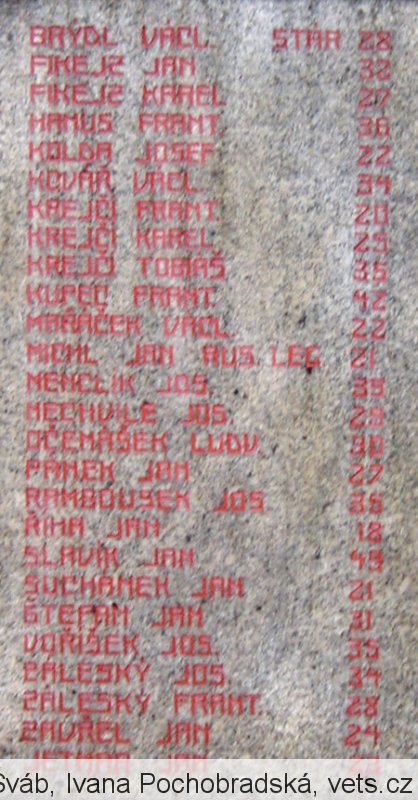 BRÝDL VÁCL STÁR. 28, FIKEJZ JAN 32, FIKEJZ KAREL 27, HANUS FRANT. 36, KOLDA JOSEF 22, KOVÁŘ VÁCL. 34, KREJČÍ FRANT. 20, KREJČÍ KAREL 25, KREJČÍ TOBIÁŠ 35, KUPEC FRANT. 42, MAŘÁČEK VÁCL. 22, MICHL JAN RUS. LEG. 21, MENCLÍK JOSEF 35, NECHVÍLE JOSEF 29, OTČENÁŠEK LUDV. 30, PÁNEK JAN 27, RAMBOUSEK JOS. 35, ŘÍHA JAN 18, SLAVÍK JAN 49, SUCHÁNEK JAN 21, ŠTĚPÁN JAN 31, VOŘÍŠEK JOS. 35, ZÁLESKÝ JOS. 34, ZÁLESKÝ FRANT. 28, ZAVŘEL JAN 24, JETMAR JAN 23
