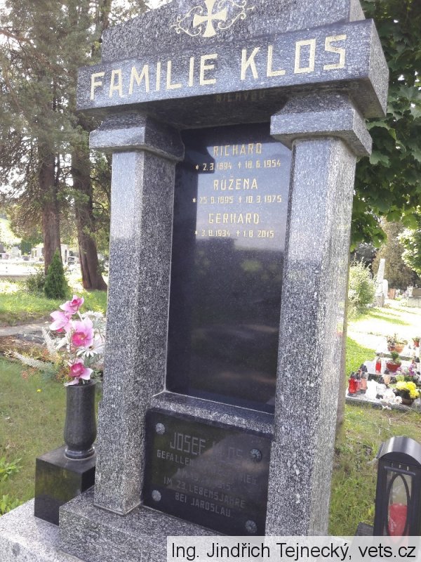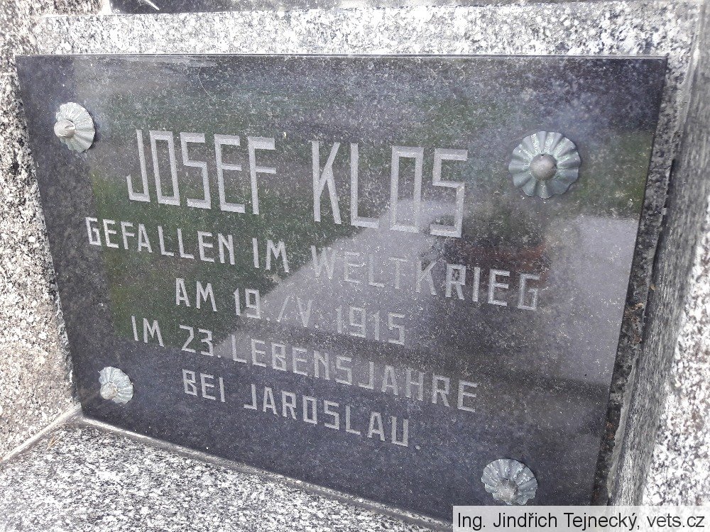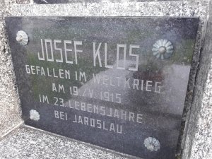 Klos Josef: *26.6.1892 Fulnek. Svobodný, tkadlec. Korp., IR. Nr. 100. +19.5.1915 FeldLaz 3/6 Cieszacin, okr. Jaroslaw, Halič. Střelná rána do hlavy. Tamtéž pohřben