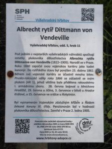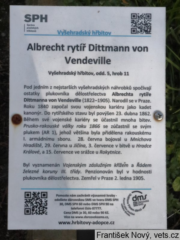 Pod jedním z nejstarších vyšehradských náhrobků spočívají ostatky plukovníka dělostřelectva Albrechta rytíře Dittmanna von Vendeville (1822-1905). Narodil se v Praze. Roku 1840 započal vojenskou kariéru jako kadet kanonýr. Do rytířského stavu byl povýšen 23. dubna 1862. Během vojenské kariéry se účastnil mnoha bitev. Prusko-rakouské války roku 1866 se zúčastnil se svým plukem (AR 1), jehož většina byla přidělena rakouskému I. armádnímu sboru. 28. června bojoval u Mnichova hradiště, 29. června u Jičína, 3. července v bitvě u Hradce Králové a 15. července ve srážce u Rokytnice.