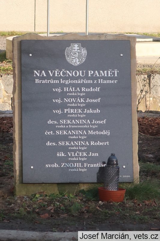 VLČEK JAN *19.4.1892 Hamry 3, řezník - uzenář, vojín olomouckého 54. pěšího pluku, zajatý na ruské frontě. 18.10.1917 podal v Petropavlovsku, Akmolinská gubernie (dnes Akmolinsk je Astana v Kazachstánu) přihlášku do legií. 6.6.1918 zařazen do "sborohospodářské části". Poslední jednotkou byla 5. nemocnice. Demobilizován v hodnosti šikovatel 24.1.1921.
