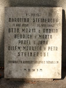 Karolina Steinerová, 22.7.1860, Praha V, 6.7.1942 deportována do Terezína, tam 16.8.1942 zahynula