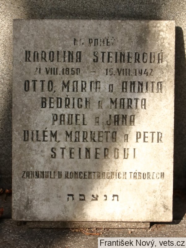 Vilém Steiner, 28.7.1901, Markéta Steinerová, 19.11.1906 a Petr Steiner, 21.5.1931. Praha I, 6.3.1943 deportováni do Terezína, 6.9.1943 do Osvětimi